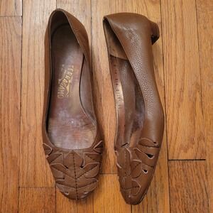 Salvatore Ferragamo Leather Leaf Cutout Ballet Flats 8.5B Brown Earthy Granola