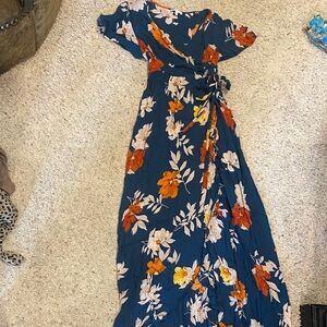 Chic floral maxi dress with a wrap design. Blue base with vibrant orange and white flowers. Perfect for any occasion.