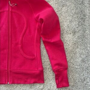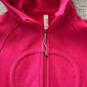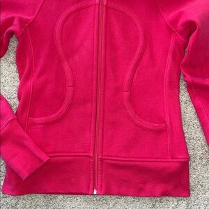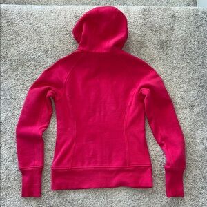 Lululemon Pink Hooded Zip-Up Jacket. Stylish pink hooded jacket with zip-up front. Features lululemon logo on the hood. Pockets. Heavier weight. Laying flat approx 24” shoulder to hem, 17.5” pit to pit. 70 cotton 30 polyester. Size 6. Excellent condition.