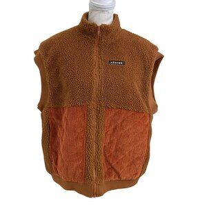 NWOT RÉSUMÉ WOMEN'S GERTARS TEDDY QUILTED CORDUROY BEST IN COGNAC BROWN - OS, this is a RÉSUMÉ COPENHAGEN rare super cozy vest in a teddy and quilted corduroy front patch fabric- sleeveless of coruse it has a full zip up style with a fun colorful floral print lining which recalls the 70s peace and love era - ribbed sleeve opening and hemline - high neck - lined - front media pockets (usable), perfect preppy gorpscore piece for a transitory season like fall and spring over a thin denim jacket, a windbreaker or just a pullover.