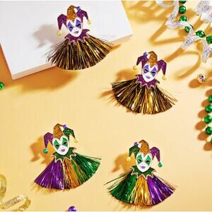 These Mardi Gras glittered jester tassel fringe earrings are bold, festive, and full of movement. Featuring a playful jester face with shimmering fringe tassels, they’re designed to steal the spotlight at parades, parties, and themed events.