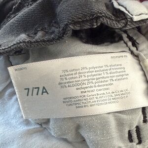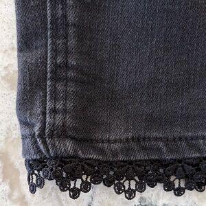 Chic black denim overall shorts with delicate lace hem in girl’s size 7. Adjustable straps. Lightly worn — no stains, holes, or imperfections. Perfect for spring break travels and warmer weather.