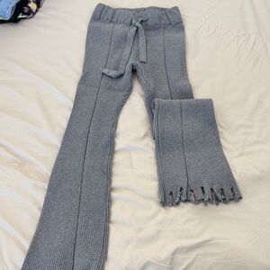 Soft gray knit pajama pants. Features a drawstring waist and unique hem design.