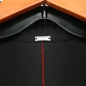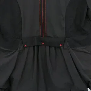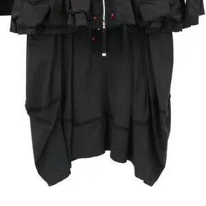 Jacket has a full zip front, pleats at the elbow, two lower slouch pockets, pleats around the peplum hem with with scattered drawstrings. Peplum part is lined.