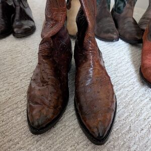 Rugged and stylish Justin ostrich cowboy boots Distressed leather shank for a classic look. Perfect for everyday wear. these are in fabulous condition. brand new soles only worn a couple of times. these are truly a classic that can be worn with jeans or sport coat.