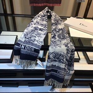 Chic Dior scarf with elegant navy and white pattern. Perfect for adding sophistication to any outfit.