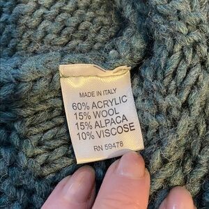 Elsamanda Knit Sweater. Made in Italy. Size Small with Tie Front and great feminine Large Ruffle or Shawl Collar(not sure what they call it). Wool blend- 60% Acrylic, 15% Wool, 15% Alpaca and 10% Viscose. Professional dry clean. I have a hard time with colors so I’m unsure of the color but I feel like it is green, blue or somewhere in between those colors but I could be wrong and you might feel it’s a different color all together. Colors may be off in pictures because of lighting. Measurements are extremely rough as this was difficult to measure because it has a single tie that can be tightened all the way or worn looser. I took my rough measurements with the tie in its tightest position. I feel this is in good used condition but because it’s not new, it shows signs of wear and may have imperfections. Bundle with other items from my closet and only pay 1 shipping fee up to 5 lbs packaged.