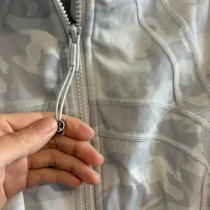 Keywords: Lululemon jacket, athletic wear, athleisure, camo print, full zip, thumbholes, performance, workout gear, yoga jacket, active lifestyle, outdoor activity, lightweight jacket