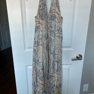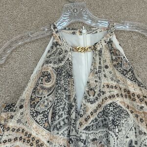 Chic paisley halter dress by Ann Taylor. Features black, cream, and tan hues, with subtle metallic threading throughout. Beautiful pleated skirt, self tie belt. Gold neck detail. Perfect for versatile styling.
