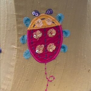 Adorable bright green and hot pink lamp shade with embroidered insects. Features pink, yellow, purple, and blue accents and sequins.