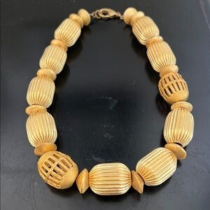 Elevated and bold, this vintage-inspired gold necklace features oversized ribbed barrel beads with beautiful texture and shine. Alternating smooth and open-cut cage beads add dimension, while the matte-gold finish gives it an elegant, timeless look.