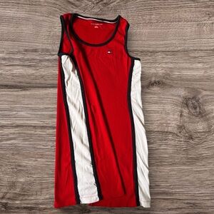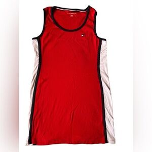 Vibrant red dress. Black and white , red trim detail. Iconic logo on front.