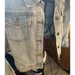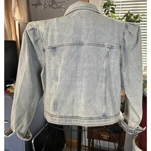 A light wash denim jacket featuring pleated puff shoulders and a cropped silhouette. In great condition, no holes or tears, all buttons in tact.