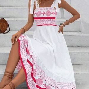 Step out in style with this chic white and red patterned maxi dress. Perfect for any occasion, it offers a blend of elegance and comfort.