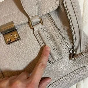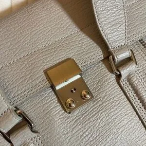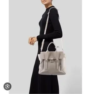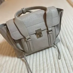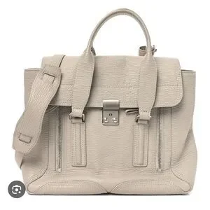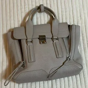 Chic leather satchel by 3.1 Phillip Lim. Features a sleek lock closure and adjustable strap. Ideal for daily wear. Durable leather with solid handles, and crossbody strap. Silky interior and single zip pocket. Hardware shows next to no signs of use and there’s only a very small spot to account for on the front as can be viewed in one of the photos. May find additional ever so slight signs of love but nothing to major or obvious. Consult the photos and video closely. Light gray, authentic and comes from a smoke free home. I love this bag but I have a lot of bags and need to move some of them along. Please refer to all of the photos provided to be certain of the details and condition. Measures approx. 17 inches wide at the widest, 11 inches in hight and nearly 6 inches wide. Carry all your faves in this stylish luxury piece. Excellent condition IMO. Thanks for looking!