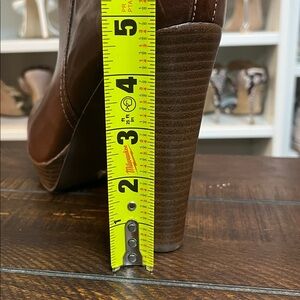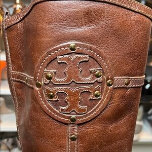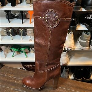 Elegant Tory Burch Colleen studded platform knee-high chestnut leather boots with side zipper. Features logo detail and stud accents.