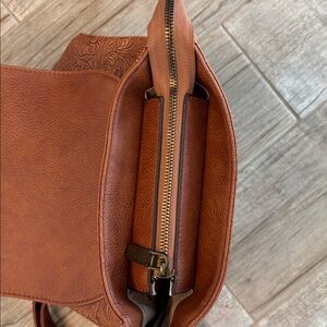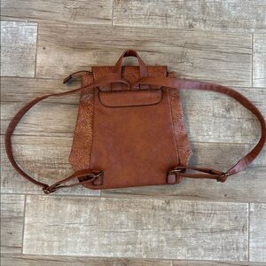 Item: Genuine brown leather backpack with intricate embossed design. Perfect for everyday use.
