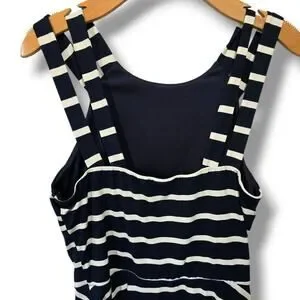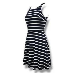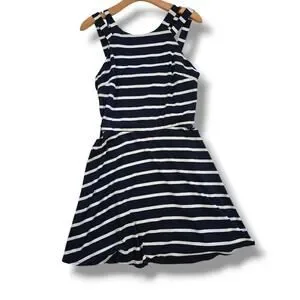 Classic nautical-inspired navy and white striped sleeveless dress by iZ Byer featuring a flattering fit-and-flare silhouette and double strap back detail, 35" in length. Made from a soft, stretchy polyester-spandex blend for all-day comfort and shape. Perfect for casual outings or summer events. Gently used, excellent condition.