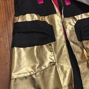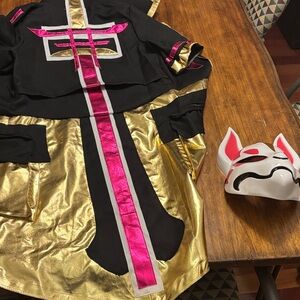 Bold black and gold ninja outfit. Includes striking mask. Perfect for Halloween fun.