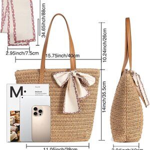 Features: Crafted from 100% natural straw with reinforced polyester lining and durable PU shoulder straps—triple-stitched for heavy loads. Features a secure top zipper closure, internal pocket for quick access to keys or lipstick, and folds flat for easy packing. Spacious enough to carry water bottles, tablets, towels, sunglasses, and more—ideal for beach days, travel, or everyday errands. The included silk scarf adds a luxe touch that can also double as a hair accessory.