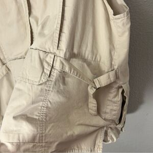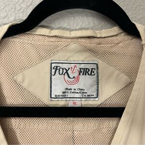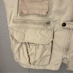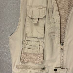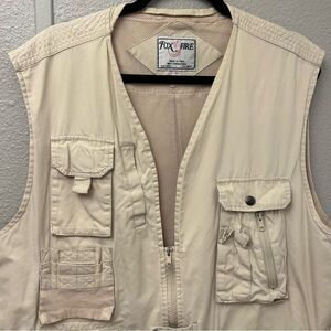 Foxfire utility vest in beige. Features multiple pockets and a zip closure.