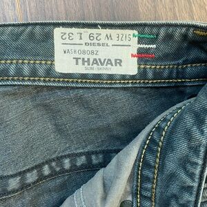 Authentic Diesel men’s jeans, Thavar fit, size W29 L32, wash 0808Z. Classic Distressed greenish wash denim with a slim modern silhouette. High-quality construction and durable fabric typical of Diesel jeans.