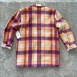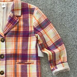 Nordstrom Plaid Button-Up Jacket. Vibrant plaid jacket with button-up front. Features a mix of purple, orange, and yellow colors. Long sleeves. Soft fuzzy feel. Lined. Hidden pockets. Laying flat approx 29” shoulder to hem, 19” pit to pit. Size Girls/Teen XL (14/16) BUT fits like a XS Adult. I purchased this for myself, to wear. 60 polyester 35 acrylic 2 wool 3 other. NWT.