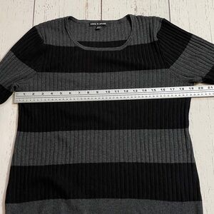 Cable & Gauge black and charcoal gray striped lightweight sweater. Vertically ribbed knit, bell sleeves, Rayon/polyester blend fabric, super soft, comfortable and stretchy fit. Measurements provided in photos. In excellent condition, only worn once or twice.