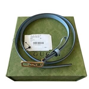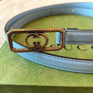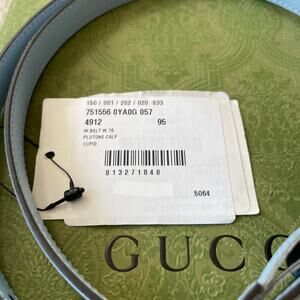 Elevate your wardrobe with this brand new, authentic GUCCI Light Blue Thin Leather Belt in the signature "Cupid" shade. Crafted in Italy from premium Plutone calf leather, this 95cm (37in) belt features a stunning gold interlocking GG buckle and elegant thin strap design. Includes original Gucci box and dust bag—perfect for gift-giving or personal luxury. Style #751556 0YA0G 055 4912. A chic and timeless accessory for fashion lovers and collectors.