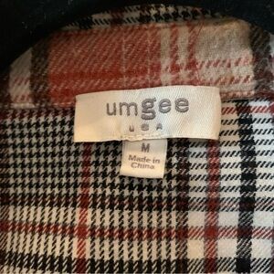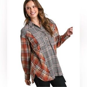 Umgee Mixed Plaid Flannel Half Button Down Frayed Hem Fall Brick Sz M