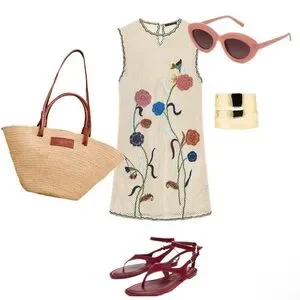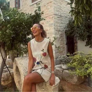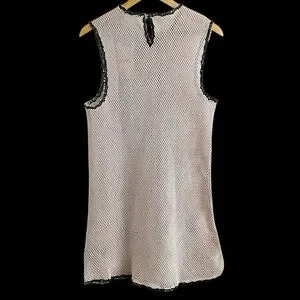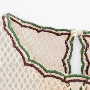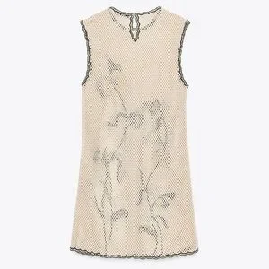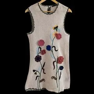 Short dress made of crochet-style fabric. Round neck and sleeveless design. Contrasting floral embroidery detail. Flared hem.