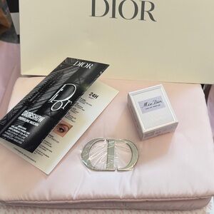 Elegant Dior accessory with a silver logo. Comes with a soft pink cushion. Includes Miss Dior sample and Diorshow mascara card.
