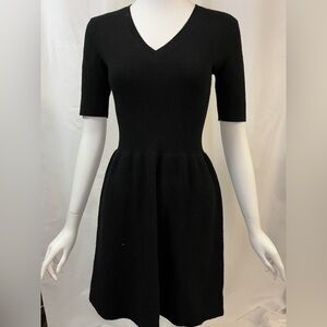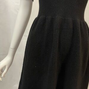 Chic black Theory cashmere mini dress. Features a flattering V-neck and short sleeves. There is a very tiny hole on the back near the right shoulder and a very tiny hole on the thigh. Both are barely noticeable but is the reason for the reduced price. #warm #cozy #classic #sexy