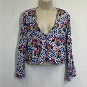 Zara - Colorful Floral Boho Bell Long Sleeve Lightweight V Neck Blouse Size Small