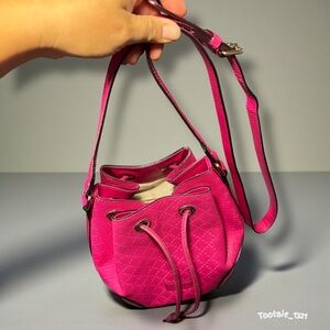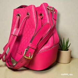 Gucci Diamante Bright pink Bucket Bag, also sometimes referred to as the Hilary bucket bag, in a hot or fuchsia pink shade. It features the brand's distinctive embossed diamante pattern on textured leather, gold-tone hardware, and a drawstring closure.