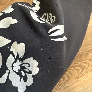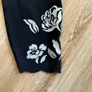 Chic black leggings with eyelet detail. Ideal for workouts or casual outings. Silver flowers with small cutouts. See photos