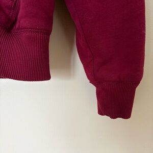Cozy Gap zip-up hoodie in deep maroon—sherpa fleece lining, kangaroo pockets, adjustable hood. Soft cotton blend, slim fit size L (fits like M, ~38–40” chest). EUC: no stains/pulls, perfect winter layer!