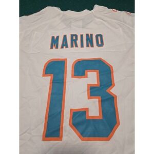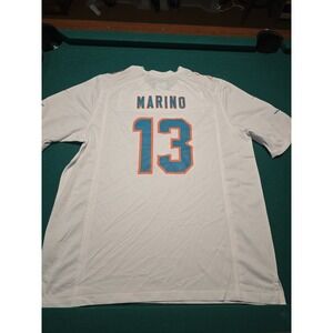 The product is a throwback men's game on-field jersey of Dan Marino #13 in his Miami Dolphins uniform, designed by Nike. This officially licensed NFL jersey is in white, featuring the iconic colors and logos of the Miami Dolphins. The XL size ensures a comfortable fit for male fans looking to show their support for the team and player during the regular season. This jersey is a must-have for any football enthusiast wanting to represent their favorite player and team on game day.