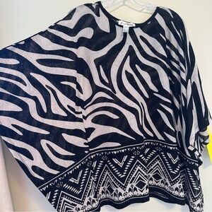 New with tags Joseph Ribkoff top with zebra print on top and an Aztec-like geometric print on the bottom. Poncho / batwing style with sides sewn for flattering fit. Lightweight material with stretch is slightly sheer (see closeups of fabric).