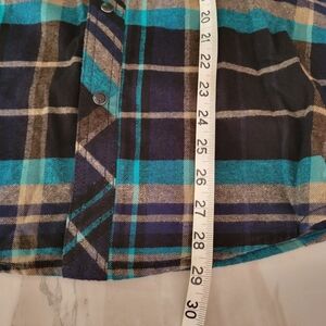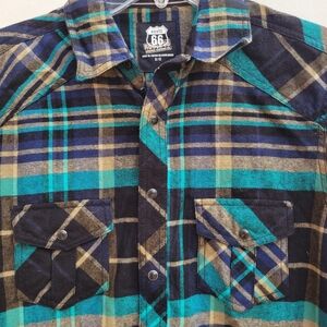 The Mens Plaid Flannel Button Down in size small by Route 66 is a stylish and versatile addition to any man's wardrobe. Made of comfortable cotton flannel in a classic blue and black plaid, this shirt features a collared neckline, long sleeves, and a regular fit. The Western theme and colorful outdoor accents make it perfect for casual occasions in all seasons. The machine washable design ensures easy care and longevity, while the button-up closure adds a touch of sophistication to the overall look. Perfect for winter, fall, or spring, this shirt is a fashionable choice for the modern man.