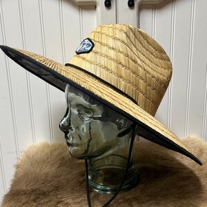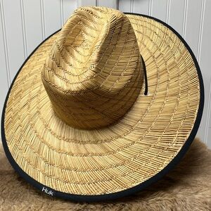 Stylish straw hat by Huk. Features a bold black trim and logo patch. Perfect for outdoor adventures.