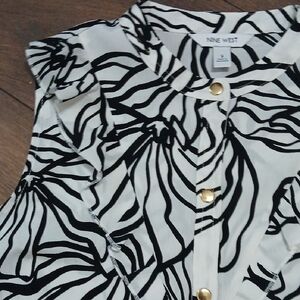 Grab this Nine West size Small, never worn, without tags, black and white gold snaps blouse with ruffle. Perfect for work wear or out running errands with your favorite jeans, easily looking put together.