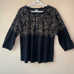 J. Jill Black Gold Embroidered Floral Boho CottageCore Blouse Size M