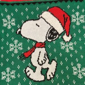 Charming green sweater featuring Snoopy in a Santa hat. Ideal for holiday cheer.