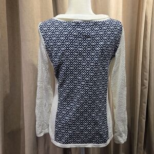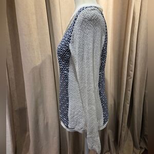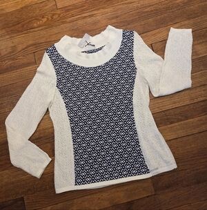 Stylish Cream and Navy sweater with intricate pattern. Perfect for any occasion. Boat neck, medium weight, high end brand, approximately 18" pit to pit, approximately 23.5" shoulder to hem.