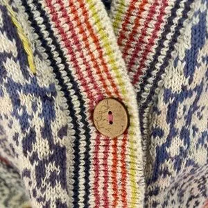 Chic cardigan with intricate patterns. Features a blend of cream and blue tones. Ideal for layering.