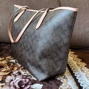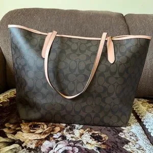 COACH Brown/Pink Signature Coated Canvas Gold-Tone Hardware City Tote Bag