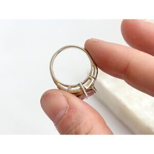 Sterling silver vintage pink topaz and cz gemstone ring. The stones are all held in prongs. Center stone is pink topaz whereas the outer stones are cz and are round cut. Lovely little piece.