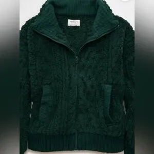Cozy green fleece jacket with zip closure. Features a textured design and front pockets.