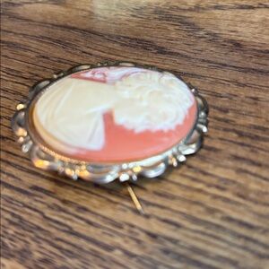 Really pretty large cameo pin. It’s not a real shell cameo but the face is still beautiful and could add a touch of class. Frame is 2” x 1 1/2”